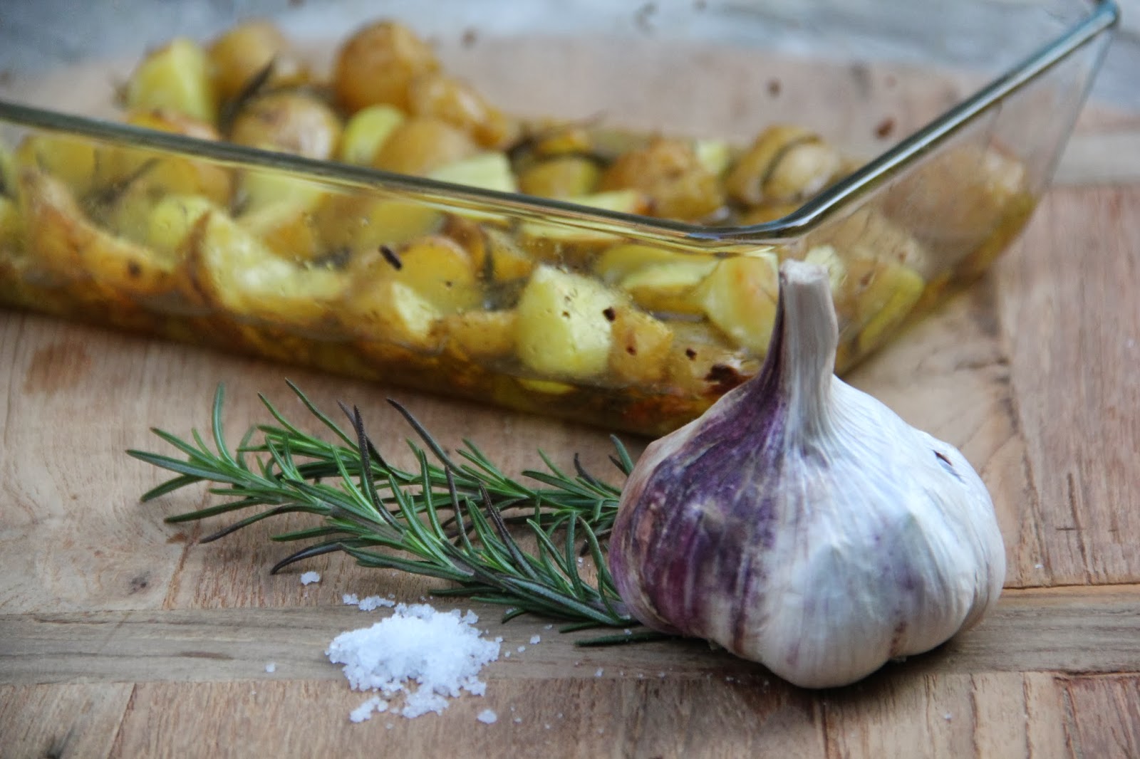 Aardappels uit de oven met knoflook en rozemarijn .Aardappelen uit de oven met citroen, rozemarijn en tijm , uit het kookboek 'Doordeweeks' van Hugh Fearnley-Whittingstall. Kijk voor de bereidingswijze op okokorecepten.nl.