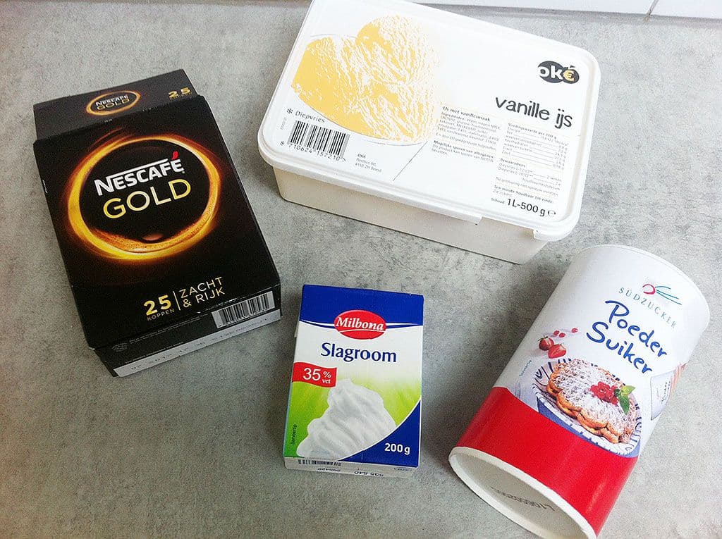 Bolletje vanille ijs . Dalgona. Deze ijskoffie met een luchtig schuimlaagje komt oorspronkelijk uit Zuid-Korea. Je maakt ‘m door de koffie op te kloppen met de suiker en het hete water.