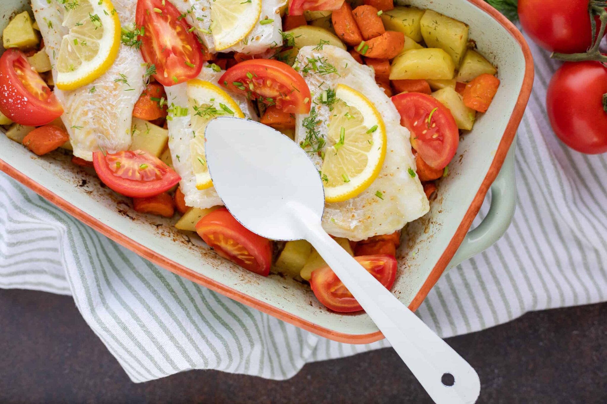 Ovenschotel met kabeljauw , aardappelen en tomatensaus, een Italiaans geïnspireerde schotel die langzaam garen in de oven combineert. 20 minuten minuten Voorbereidingstijd.