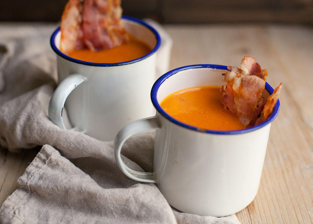 Ingredienten voor pompoen tomaten creme soep voor 4 personen crème fraîche naar smaakbasilicumblaadjes voor de garneringJe Lekkerste Pompoensoep met Spekjes : eten en drinken tegelijk!