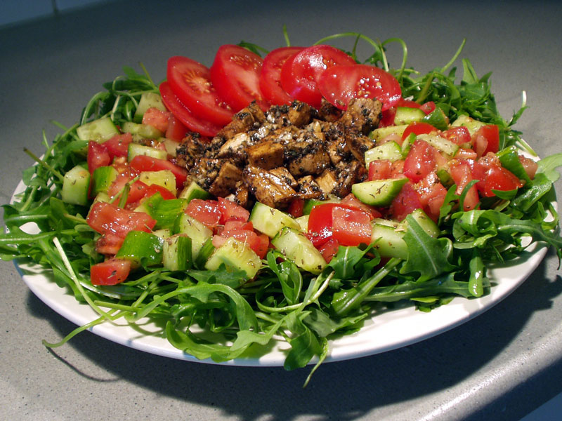 Maak nu zelf ook Salade met tomaat , komkommer en mozzarella .Deze tomaat gaat dienen als garnering. Het opmaken van de salade kan beginnen. Neem een flink bord en beleg de bodem met de rucola(1 gram) . Laat in het midden een "gat", zodat daar de vulling kan komen.