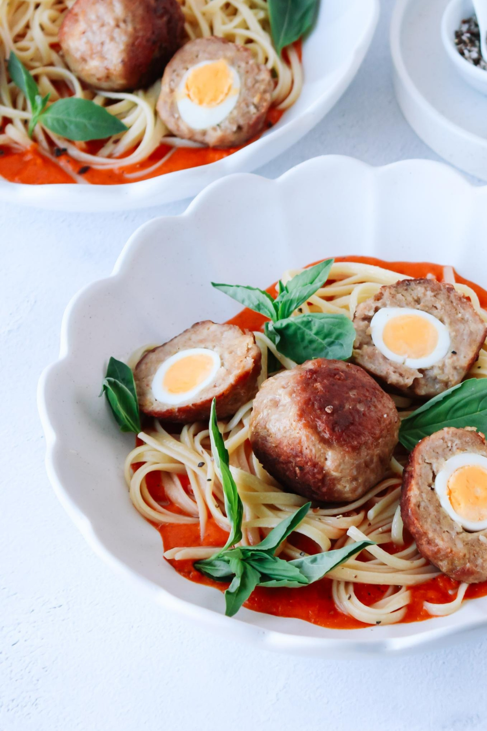 Verwarm de oven voor op 180°C. Kook 4 eieren in 10 minuten hard. Spoel ze onder ijskoud water en pel.Druk de gehaktbal goed aan en rol het vlees door je handen, tot je een egaal vogelnestje krijgt. Leg ze op een groot bord en zet ze even in de koelkast.