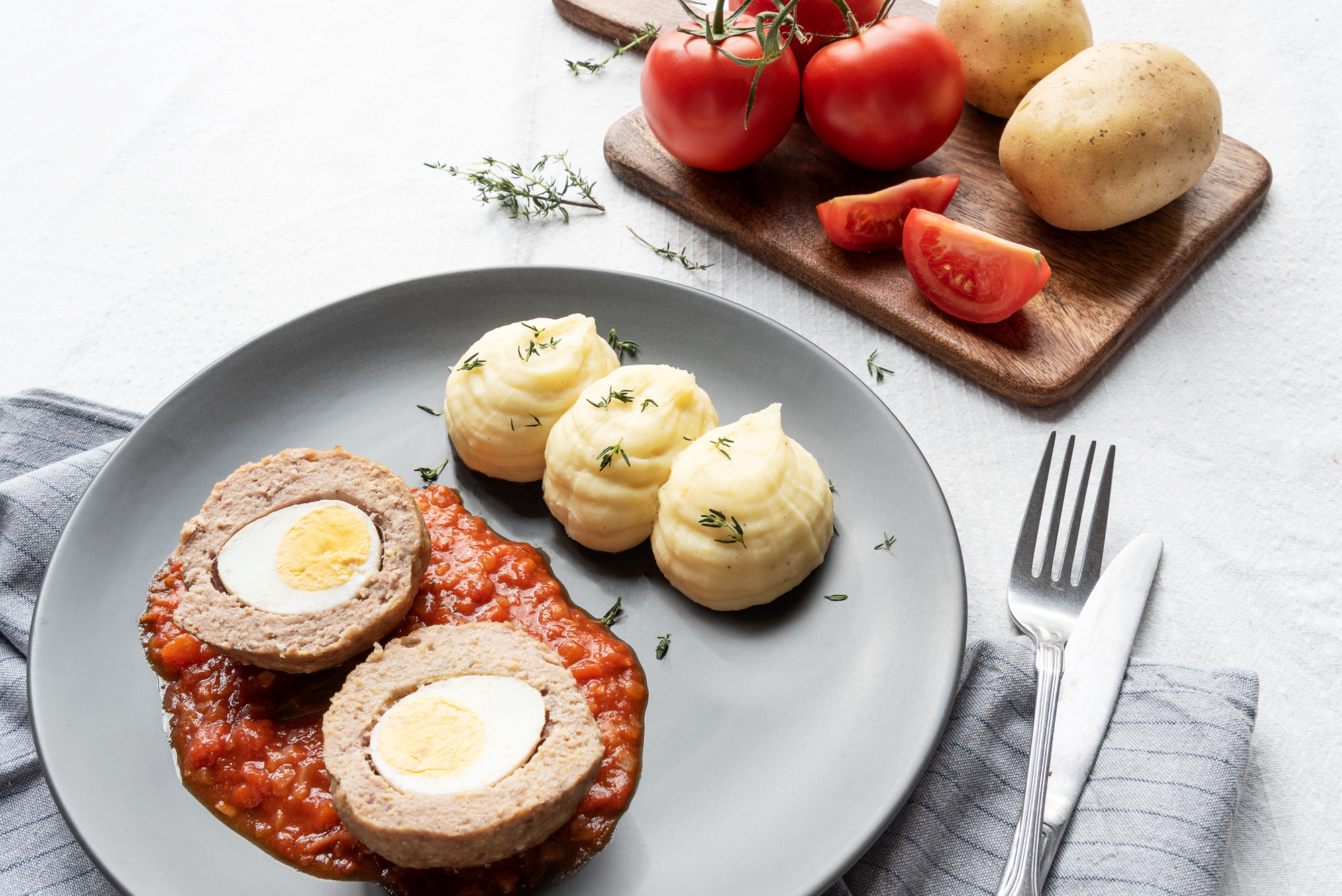 Hartverwarmende vogelnestjes van smeuïge aardappelpuree en gehakt die een zachtgekookt ei omhullen, krokant gefrituurd en afgewerkt met een rijke tomatensaus met spek en gestoofde groenten. Ideaal als feestelijk hoofdgerecht of troostrijk familiediner in het najaar, waarin stoven, koken en frituren samenkomen voor volle smaken.